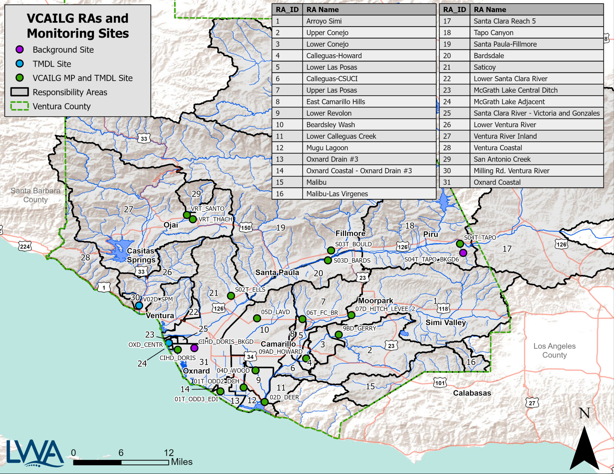 The WQMP is organized around Responsibility Areas (RAs), which divide Ventura County into distinct regions based on Total Maximum Daily Load (TMDL) boundaries, subwatershed, and crop types. Each RA has an assigned monitoring site that represents water quality conditions across the area.